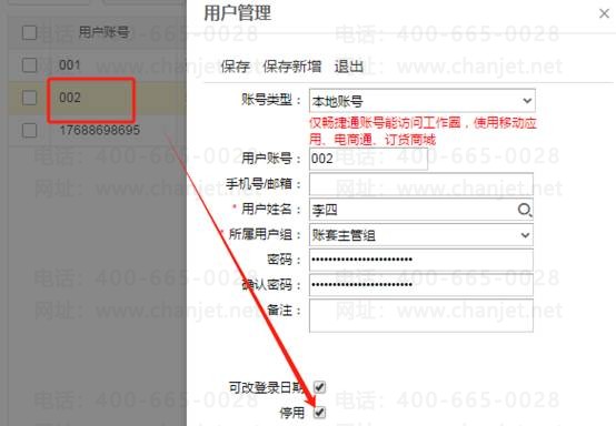 2、当员工休长假停用用户账号,具体操作如下,还是在用户权限处,双击打开需要停用的用户账号,勾上“停用”然后保存即可,如图下: