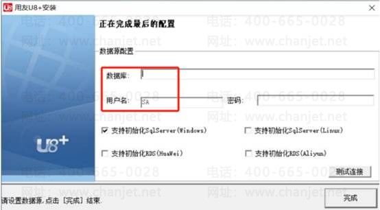 2、在图上输入数据库名称与SA对应的密码,点击测试连接,测试通过后再点击图上的“完成”键,系统会自动在应用服务器配置中生成此数据对应数据源,如图下: