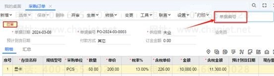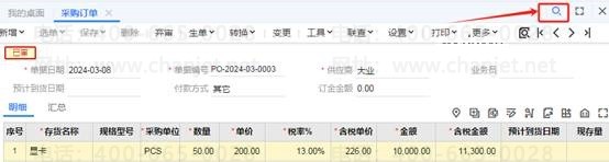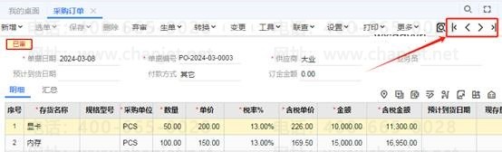 1、以查询采购订单为例,进入采购订单界面,当采购订单不多时可以点右上角的向上向下箭头进行翻查,如图下:
