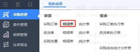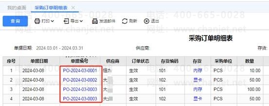 4、也可以在采购管理中的明细表查询,鼠标放置在采购管理,在跳出来的菜单中点击明细表,然后输入需要的条件并查询,就可以看到相应的采购订单明表了,点击单据编号就可以打开相应的采购订单,如图下: