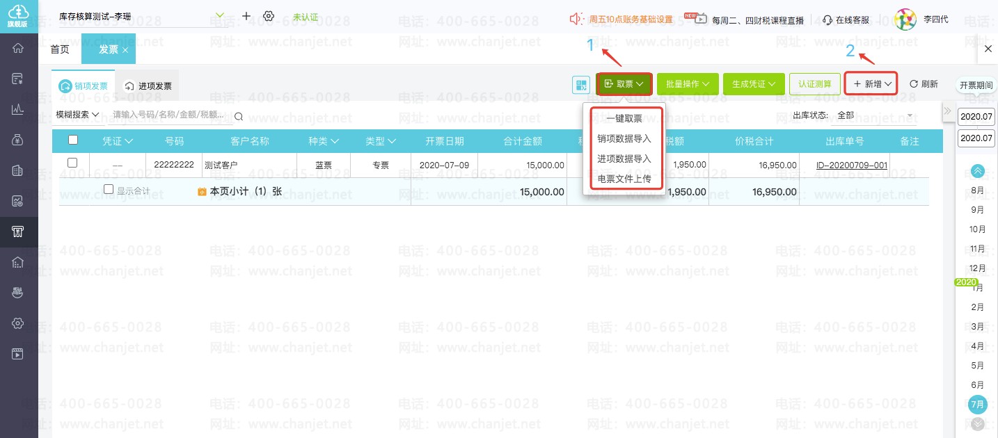 1、在发票管理中通过一键取票功能,从发票综合服务平台,将进项发票提取过来,或者是通过手工新增的方式,将发票录入进来