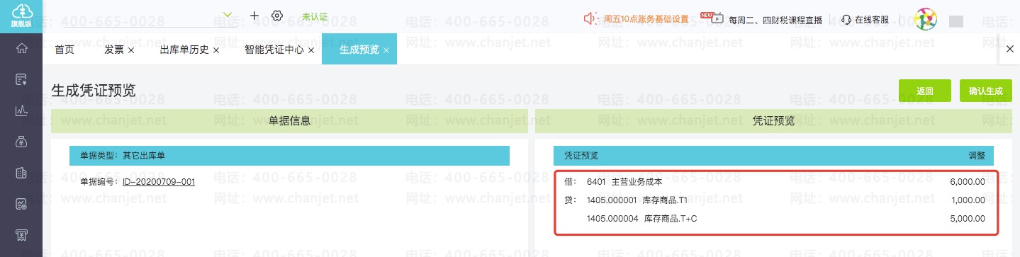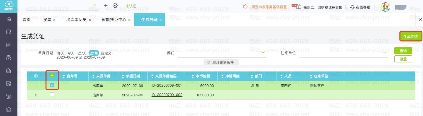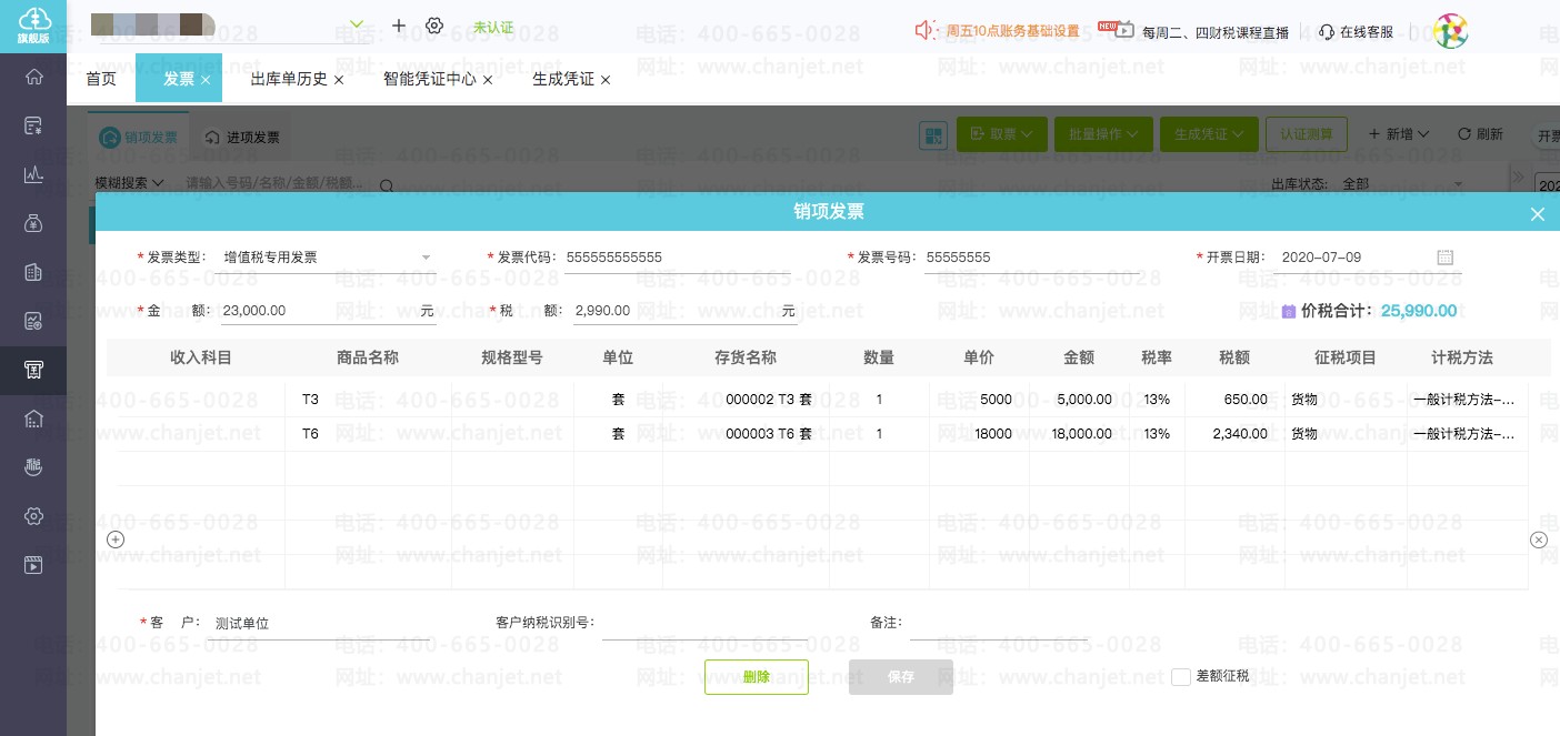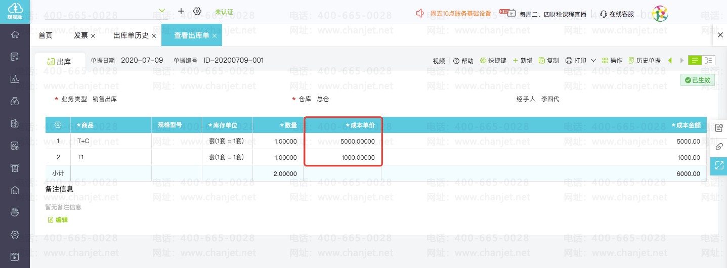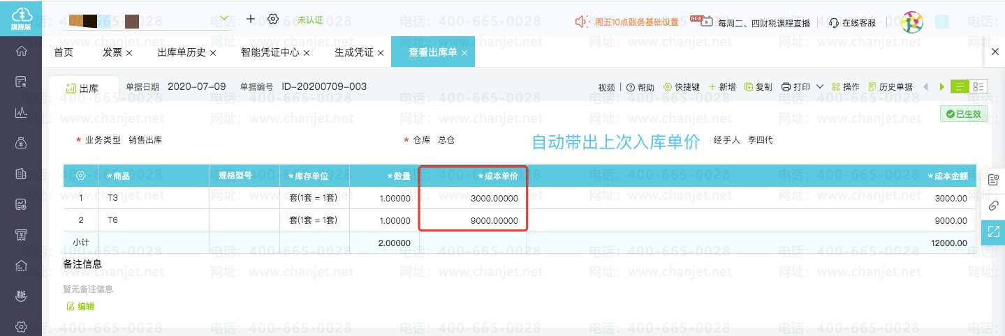 3、出库时,开具销项发票,系统自动生成出库单,自动算出出库成本