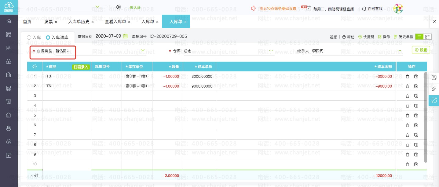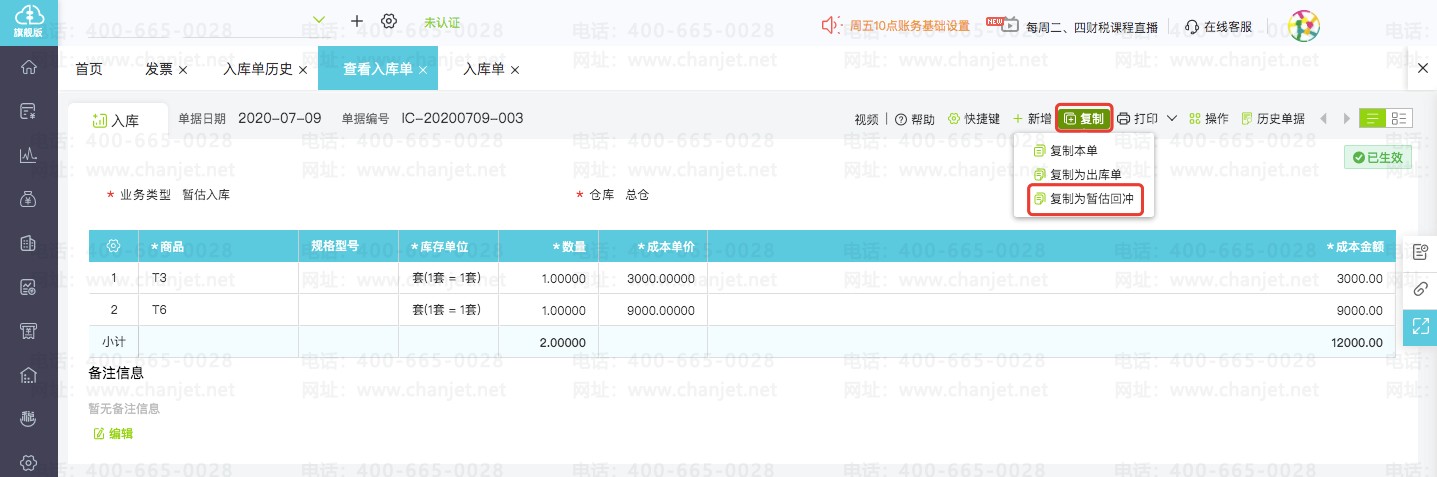 2、当收到采购发票时,将暂估入库单复制一张暂估回冲单