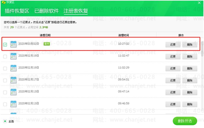 2. 选择【注册表恢复】,找到清理时间最近一次的注册表记录,点击【还原】,再点击【是】即可。