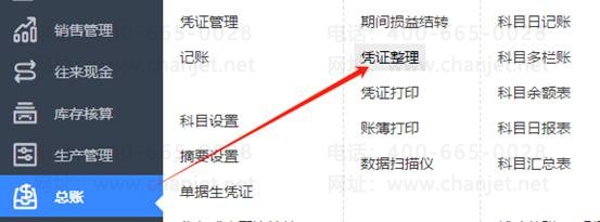 3、以上设置好就会自动填补断号了,但是有时候我们需要删除凭证,后面的凭证编号就不会变了就会存在断号,这时候就需要来整理断号,凭证编号才会连起来。鼠标放置在总账,点击凭证整理,如图下: