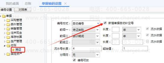 2、在单据编码设置中,选择凭证,勾上“新增单据自动补空号”并保存,如图下: