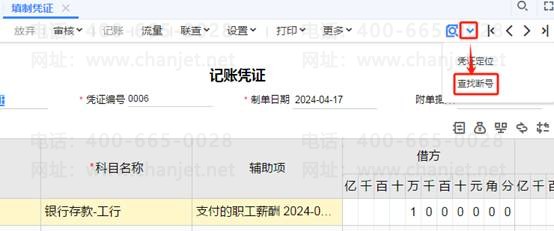 5、补充:有些人觉得重新整理编号可能会打乱凭证编号,这时候可以去查询断了哪些号,然后自已手工就补上去,如图下在填制凭证界面,点击查找断号,再点击查询就可以看到断了哪个号