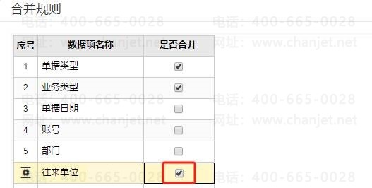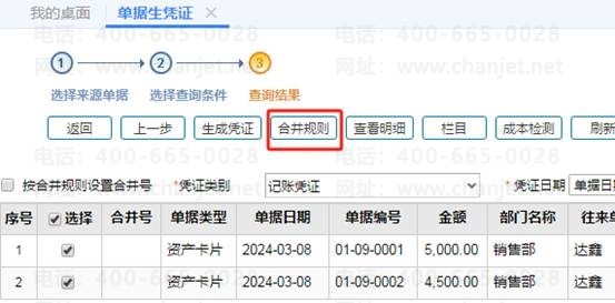 2、图上可以看到两个资产卡片的往来单位名称是一样的,就可以按往来单位名称来合并,点击“合并规则”,勾选上“往来单位”确定保存,如图下操作: