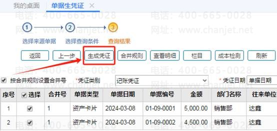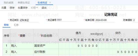 7、点击生成凭证,系统会把相同号的资产卡片生成到一张凭证上面,如图下: