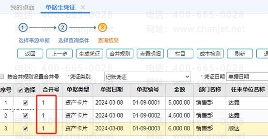 6、补充:如果不是同一家供应商的固定资产,也想合并在一张凭证上,此要求也是可以实现的,如图下在三张资产卡片的合并号处输入相同的号,比如都是1号