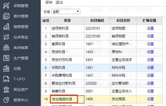 3、再进入科目设置,就可以看到发出商品科目设置了,如图下: