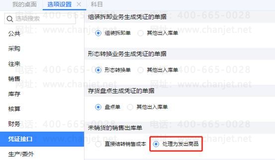 在选项设置中,点击凭证接口页签,在未销货的销售出库单处选择为“处理为发出商品”并保存,如图下: