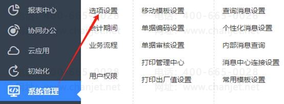 2、此时我们需要把未销货的销售出库单确认为发出商品,鼠标点击系统管理-选项设置,如图下: