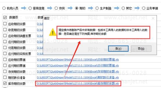 4、此时会出现如图下提示:清空操作将删除产品中所有数据!包括本工具导入的数据和非本工具导入的数据!是否确定清空下列档案:库存期初余额。确定没有问题点是即可