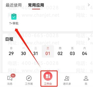 2、屏蔽自已不需要的审批消息通知,点击工作台中的T+审批,如图下: