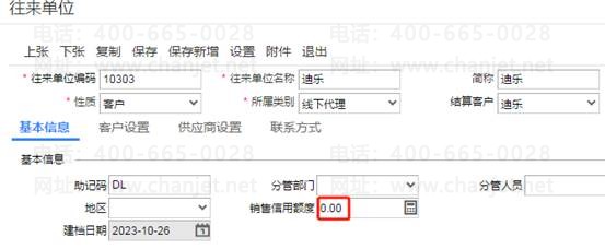 3、设置该客户的信用额度,点击基础设置-往来单位,打开此客户档案,在其销售信用额度处输入0并保存,0的意思就是当出货单金额大于0时就会触发密码控制