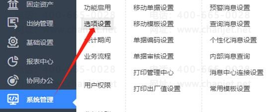 1、密码控制需要通过“客户信用控制”来实现,首先启用“客户信用控制”,鼠标点击系统管理-选项设置,如图下:
