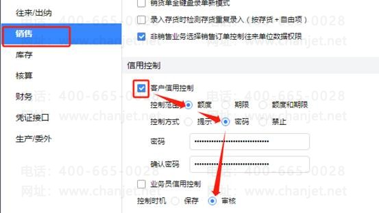 2、进入选项设置,点击销售页签,勾下“客户信用控制”,控制范围选择为额度,控制方式选择为密码,同时输入密码并确认密码,控制时机选择为审核并保存,如图下操作: