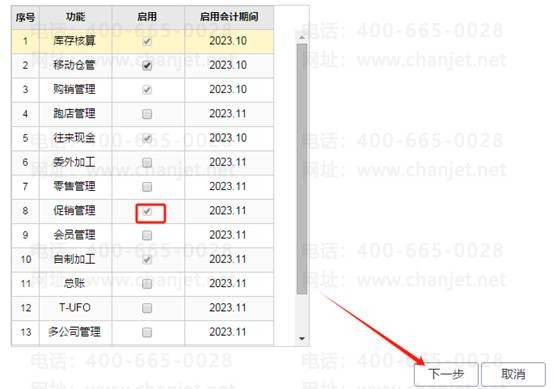 1、首先要实现以上促销的要求,需要启用促销管理(需购买),鼠标点击系统管理-功能启用,勾上促销管理,下一步完成即可,如图下操作: