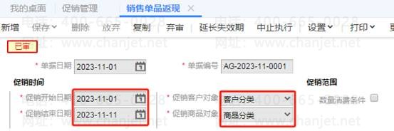 3、现在要求双11期间商品统一九折销售,期间为11月1日-11月11日,过了双11恢复原价销售。此要求可通过销售单品返现来实现,进入销售单品返现,促销开始日期为11月1日,促销结束日期为11月11日,促销客户对象为客户分类(所有客户),促销商品对像为商品分类,如图下: