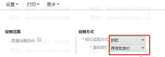 继续设置右边的促销方式,促销范围中数量消费条件不要勾,在报价返现方式选择折扣,基础报价为存货批价,意思是在存货批发价的基础上打折销售