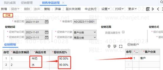 在表体明细处录入商品分类与报价折扣,再录入客户分类,然后保存并审核,图下设置的意思是这些商品为九折