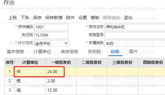 4、促销方案设置好后,现在来验证促销期间内带过来的价格是否准确,打开某个商品资料,可以看到当前伊利纯牛奶一件的批发价格为24,双11促销为九折,那么做销货单是的价格就应该是24*0.9=21.6