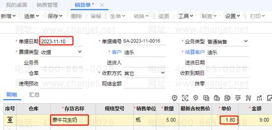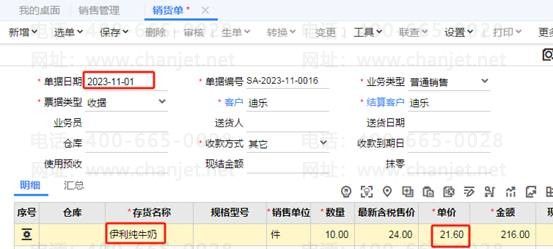 录入销货单,单据日期为2023-11-01,在促销期间内,选择伊利纯牛奶,录入数量,此时单价处会自动跳出折扣价格为21.6,如图下: