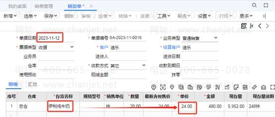 以上测试就可以看出结果是正确的,那么当过了促销期间,这个促销政策就会自动失效。录入销货单,单据日期为2023-11-12已不在促销期内,选择伊利纯牛奶,带出来的价格为24,也就是恢复了原价24,如图下:
