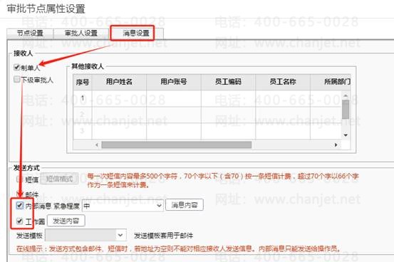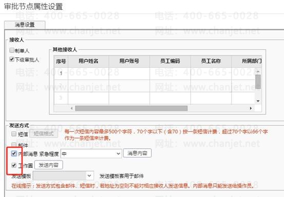 在接收人处勾上下级审批人,发送方式处勾上内部消息(登录软件才能审)或者工作圈(在APP中审),根据实际需要勾选是软件中审还是APP中审,然后保存