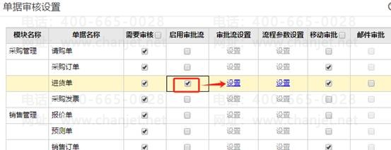 3、在进货单处勾上启用审批流并点击设置,如图下: