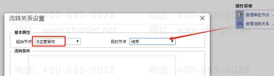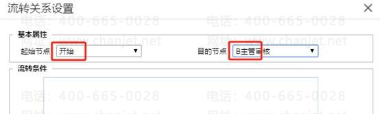 流转关系设置中,起始节点选择开始,目的节点选择B主管审核并确定保存