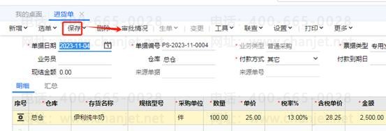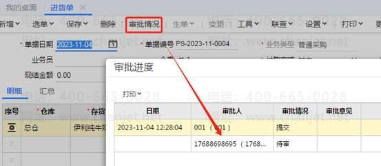 8、如果C、D人员也需要审核,再新增两个审批节点即可,就不再说明了。下面来验证上面设置好的审批流程,以制单人A登录软件,录入进货单保存,点击审批情况可以看到审批进度,如图下: