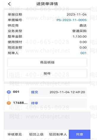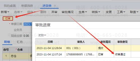 点击同意,此时进货单就显示为“已审”,审批情况是终审通过,如图下: