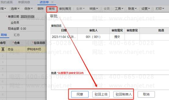 10、双击图上的消息,进入进货单界面,点击审核,如果进货单没有问题就点击同意,如果有问题点击驳回上级或者驳回制单,如图下: