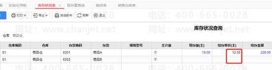 4.进入库存状况查询结果界面,显示商品仓中商品A的结存单价为12元,而商品B的结存单价为0,与销售订单上商品B的销售单位结存成本值一致。