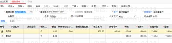 2.返回销售订单界面,新增一张销售订单,仓库选择为商品仓,表体明细填写商品A和商品B两种存货,可发现商品A的销售单位结存成本为12,单品毛利等于单价120-12=108,参考毛利等于108*1=108,而商品B由于无销售单位结存成本、所以单品毛利及参考毛利无法进行取值。