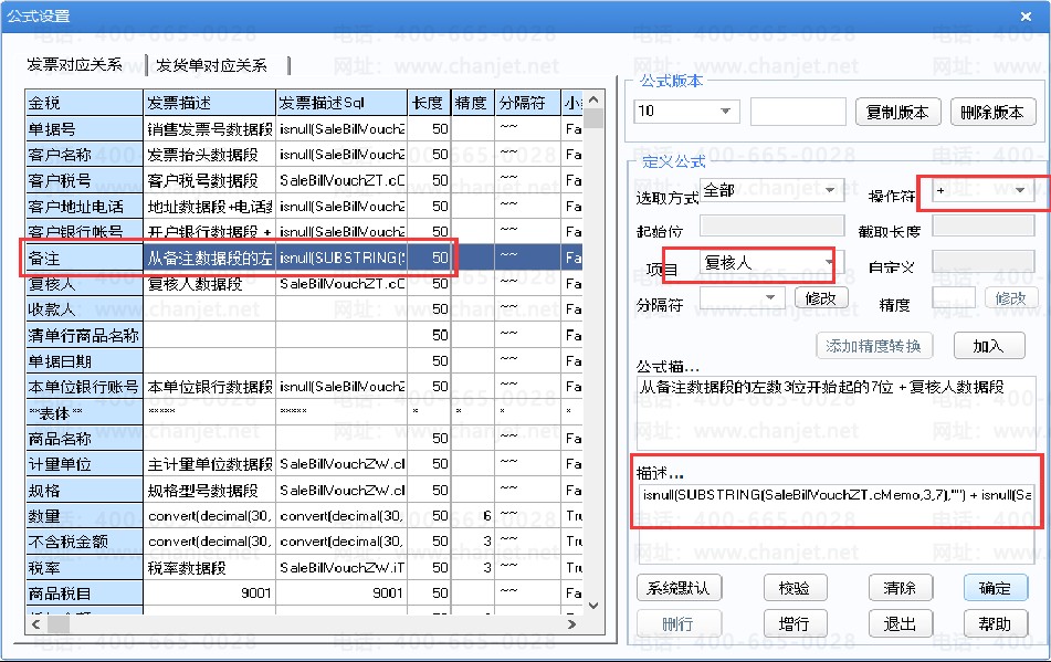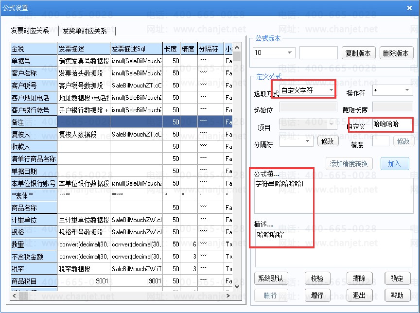 当选取方式为自定义字符时,定义公式中自定义就可以直接录入字符,录入的字符在输出时可以直接输出,