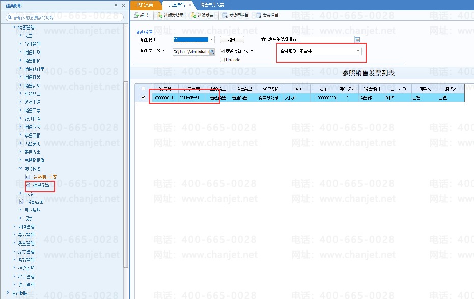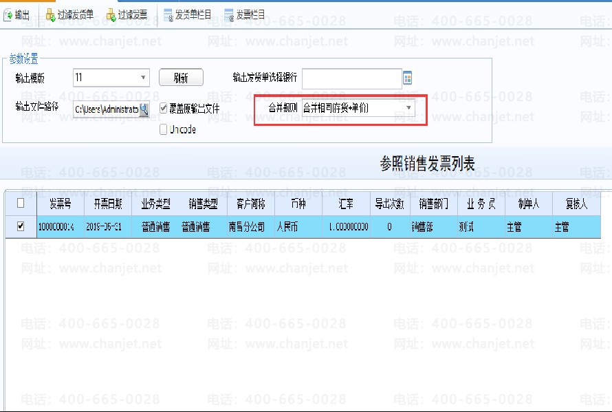 接口批量输出   接口批量输出选择需要输出的单据进行过滤(发货单或发票)、选择对应的模板 与接口设置的单据类型模板对应。
