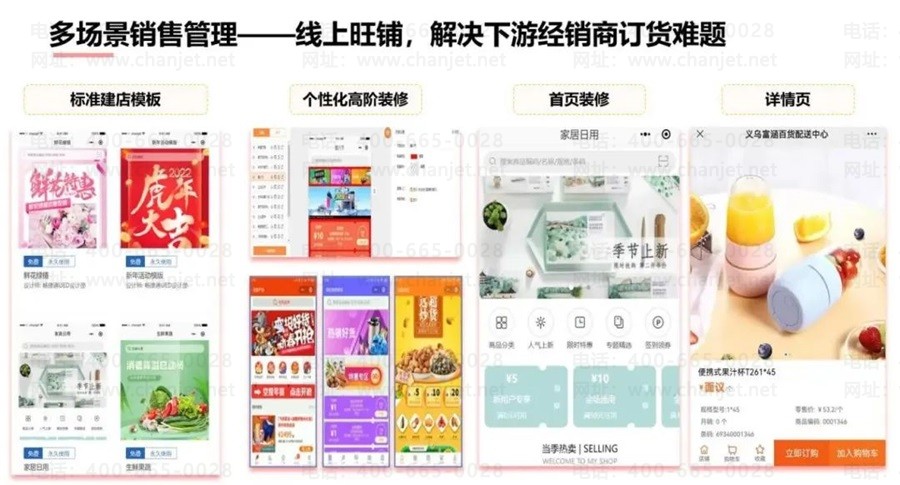 订货商城装修灵活:预置标准建店模板、支持高阶装修,帮助企业开拓线上销售通路,广拓客源、提高竞争力!