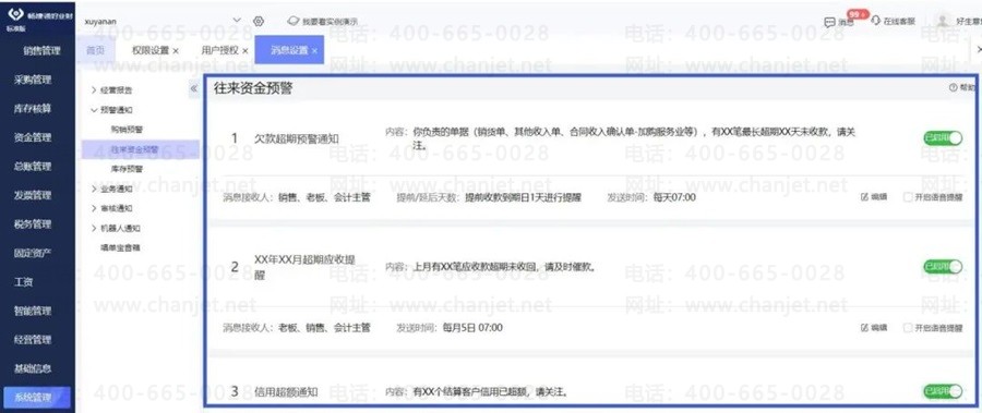 消息提醒:使用了消息提醒,系统会根据回款提醒日期,系统内发消息给财务同事,做到实时提醒,提高回款率,降低货款积压。