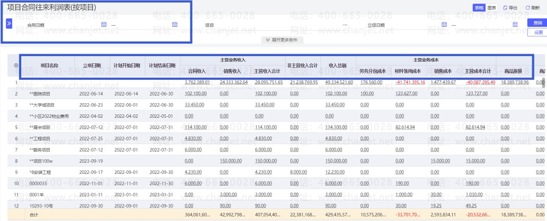 老板打开手机、电脑就能实时统计当前单个项目、所有项目的收入、成本以及毛利、毛利率等情况