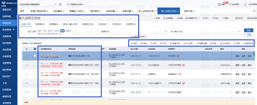 (好业财:自动生成“收入合同工作台”,自动提取合同整体情况,是否有收款预期的,开票状态、收款状态、收入确认状态,所属哪个项目经理,在一个看板上查看,往下工作)