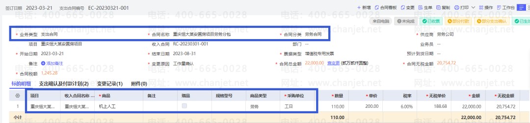 (好业财:支持按项目核算,项目下发生的公司自有人员的工资费用支出;以及与劳务分包商签署支出合同,按阶段确认应付及付款)