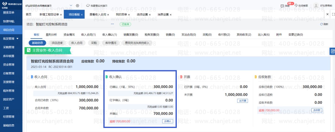 (好业财:自动根据合同收款计划预警,发送收入确认消息;项目看板重点提示收入确认金额,合同款是多少,已确认了多少,未确认是多少,本月待确认多少、已逾期多少)