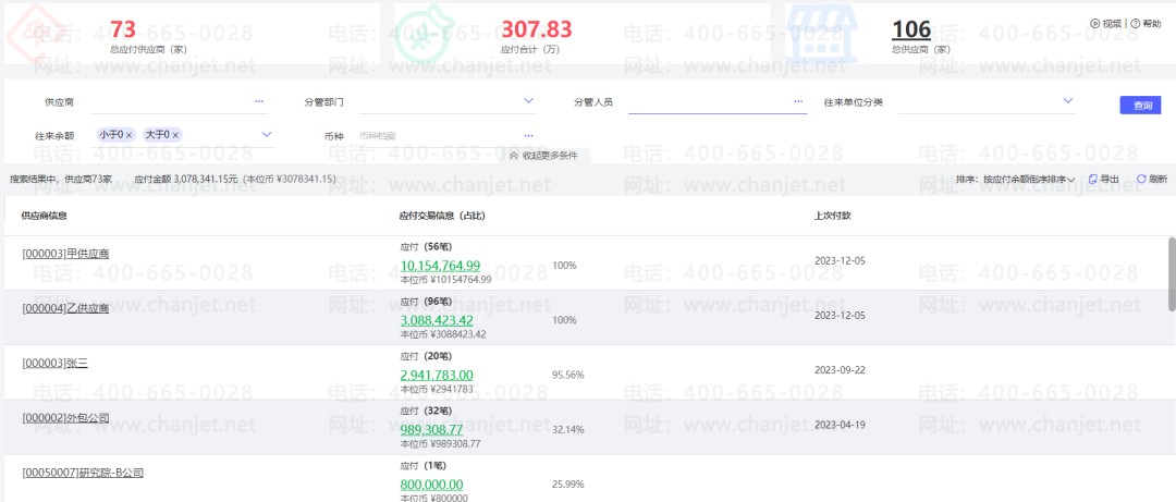 好业财:根据支出确认单及进货单,实时自动生成供应商账本及对账单,统计有多少供应商、共有多少欠款,每个供应商的欠款明细,以及每家供应商的应付、已付、往来结余。电脑上、手机上都可对账。