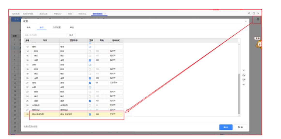 5、查询辅助明细账,右上角齿轮图标勾选规格型号字段。
