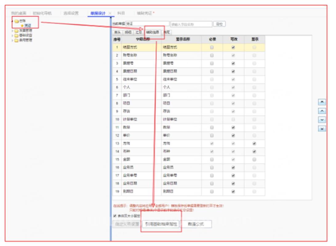 2、依次点击总账-凭证-辅助信息-引用基础档案属性。