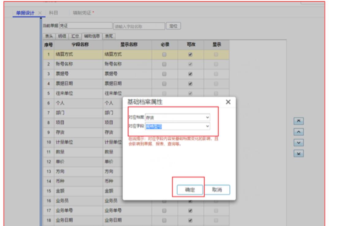 3、对应档案选择存货,对应字段选择规格型号,点击确定保存设置。