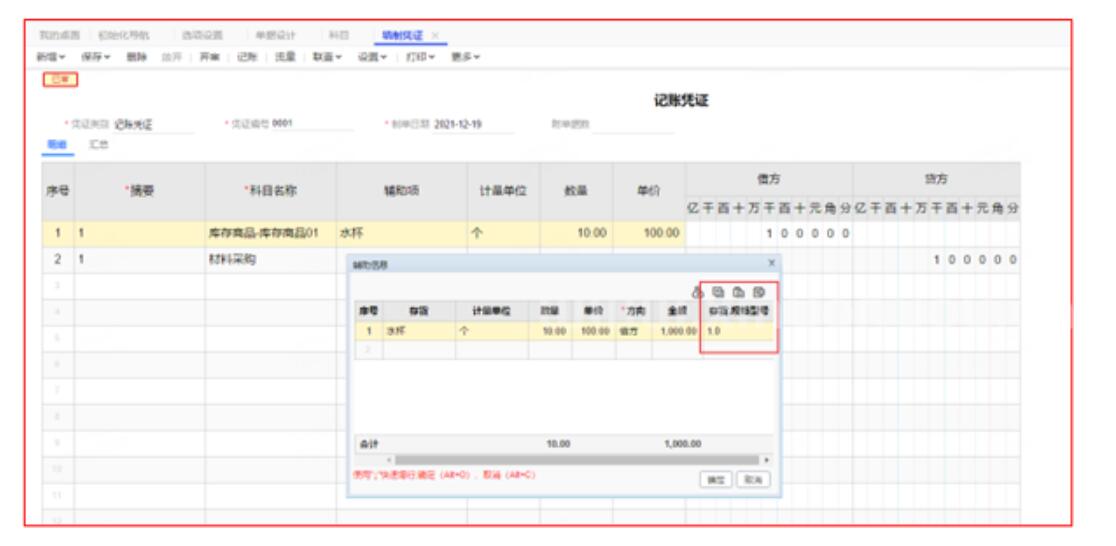 4、设置好后填制凭证时选择对应存货即可自动带出规格型号字段。